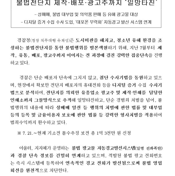 경찰청(청장 직무대행 유재성)은 도시미관을 해치고, 청소년 유해 환경을 조성하는 불법전단지를 통한 불법행위를 발본색원하기 위해,