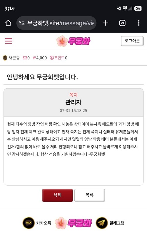 무궁화벳 이틀쓰고 먹튀 로 마감